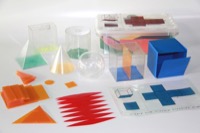 Sex tredimensionella geometriska figurer i plast. Varje figur har ett färgat lock, en avdelare och en hopvikbar begränsningsarea. Till varje figur följer också ett ark med formlerna. 6 geometriska figurer i hållbar genomskinlig plast. Figurerna kan fyllas med vatten eller sand för att jämföra deras volymer. De geometriska figurerna är: kub, rätblock, pyramid, kon, klot och cylinder. Innehåller förutom figurerna också: Begränsningsarea i kraftig plastfolie med ledade veck för att lätt kunna vikas ihop till den geometriska figuren och kan sättas runt plastfiguren. Avdelare som kan sättas i figuren och ett formelblad i plast (OH-blad) till varje figur. Förhållandet bas/höjd är 1 till 2.